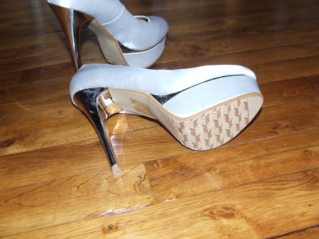 02- superbes escarpins gris satin avec talon et liseret côté argent semelles anti-dérapantes talon 14 cm dont 3 cm de compensé